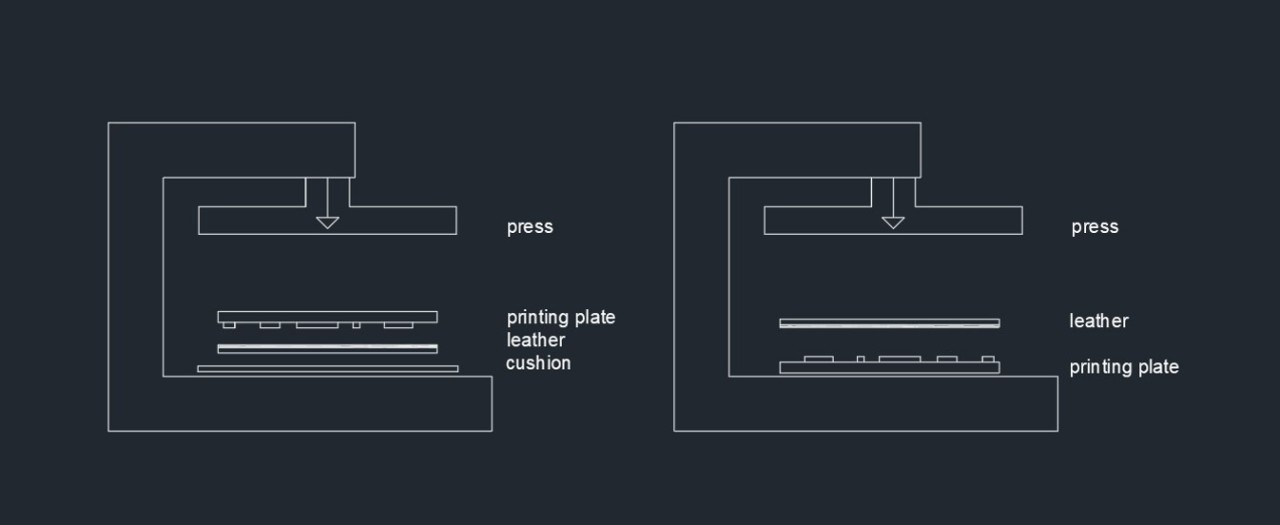 Of the technique under research, two patterned leather handbags survive in the collection of the Estonian History Museum (AM 15737/1 and AM 15737/2). The technique is a relief print or a method of decoration where a relief gets added to the surface of the leather by pressing it with a printing block. It is distinct from the usual metal cliché or linoprint by its two-dimensional result and the absence of graphic lines. As a distinct feature, the pattern is pressed onto the material without reinforcement glued to a base. As a team, we examined the technique used on the handbags in detail, comparing it to our own experiences and established a number of hypotheses of how it might have been achieved. Through subsequent experiments we tried to achieve a result that would be as close to the one seen on the handbags as possible using techniques, tools and materials as historically accurate as possible. We varied the materials that are suitable for the printing plate, tested both cold and hot pressing and determined the optimal set-up of the press. By comparing both sides of the experimental samples and increasingly improving our hypothesis, we arrived at a technique that is visually similar to the historic one, but which we called reverse printing. In conventional circumstances, a printing press pushes the printing plate against the right side of the material resting on the press base. To achieve a result similar to historical printing, a method was invented where the printing plate is placed on the press base with the pattern facing upward, leather is laid on top towards the printing plate, and the press, in contrast to the usual situation, presses the leather against the printing plate. (Figure 1)
