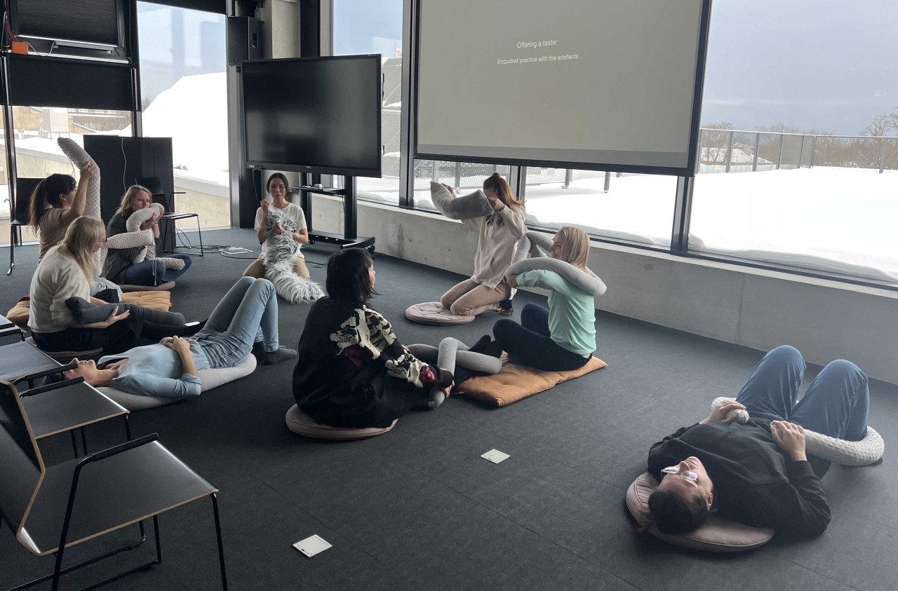 Lisaks liikumiskunstniku enda poolt kogetule kutsuti uurimusprojekti ka külalisosalejaid, kes katsetasid eset uuringu eri etappides. Nende puhul ulatus tajukandjate kasutamine omakäelisest mängust ja uurimisest kuni täielikult juhitud seanssideni, mille hulka kuulus ka lõplik kogemuste jagamisüritus (foto 4). Nende kehalised kogemused aitasid uurimisprotsessi käigus kaasa objekti disainile.