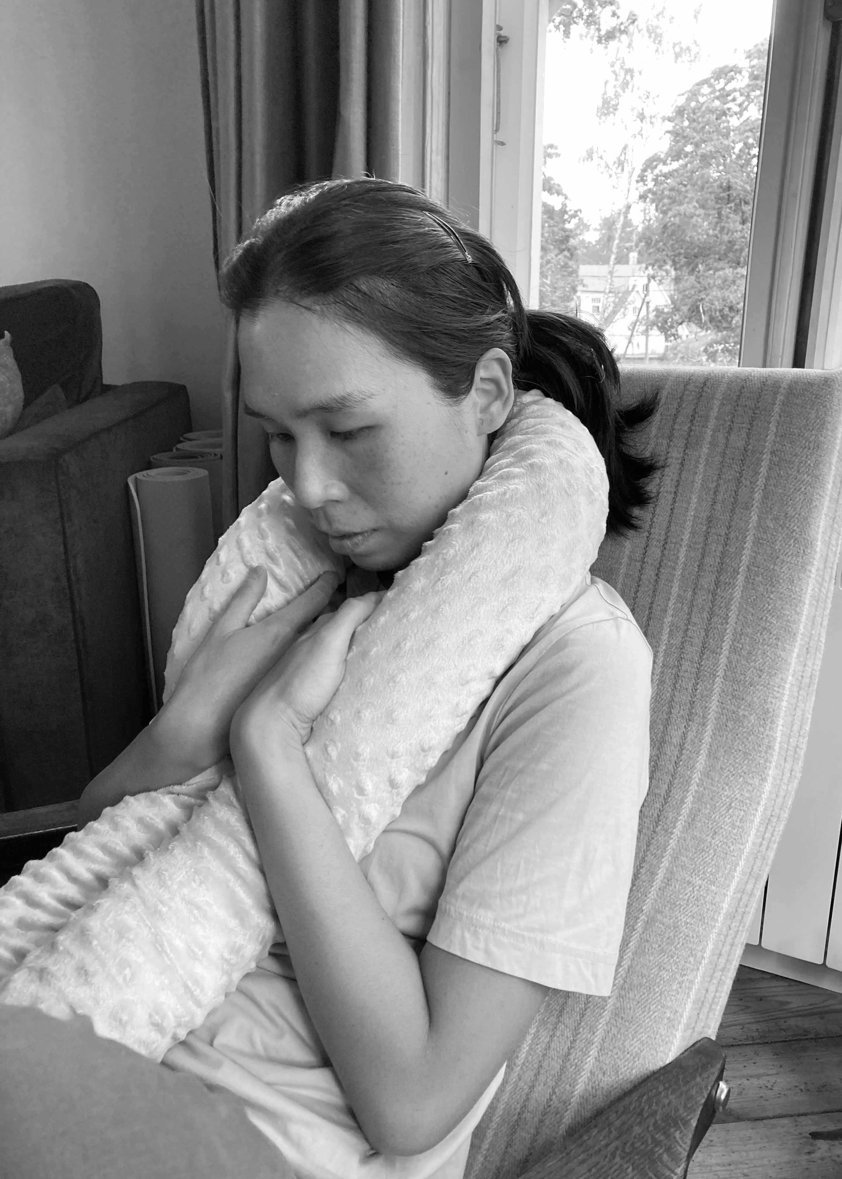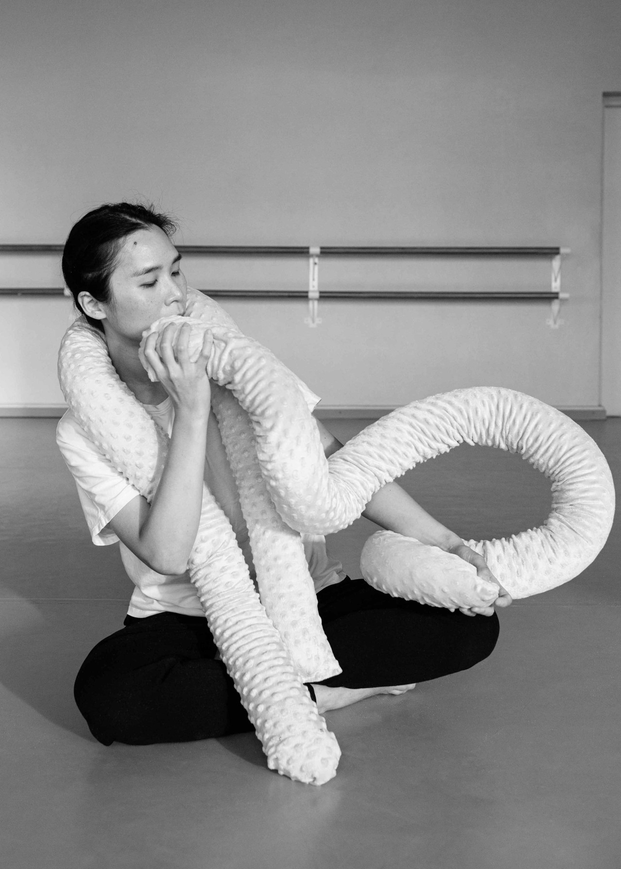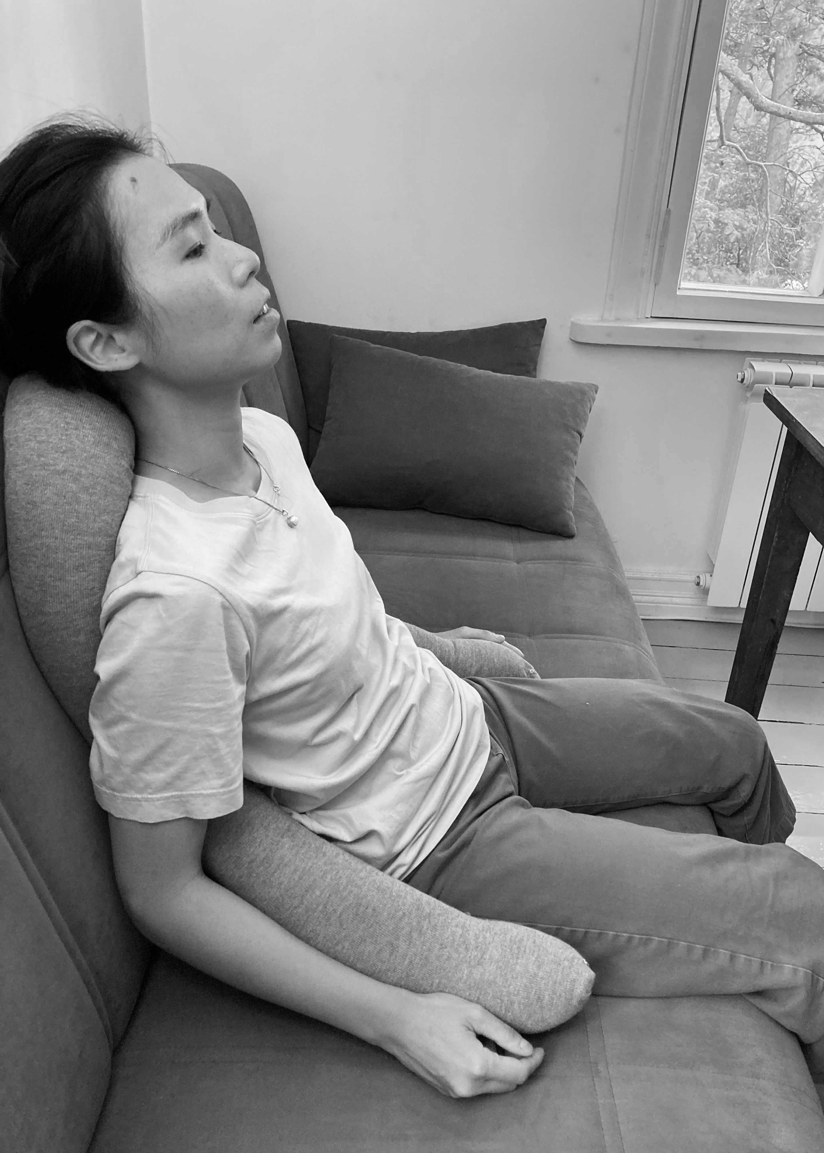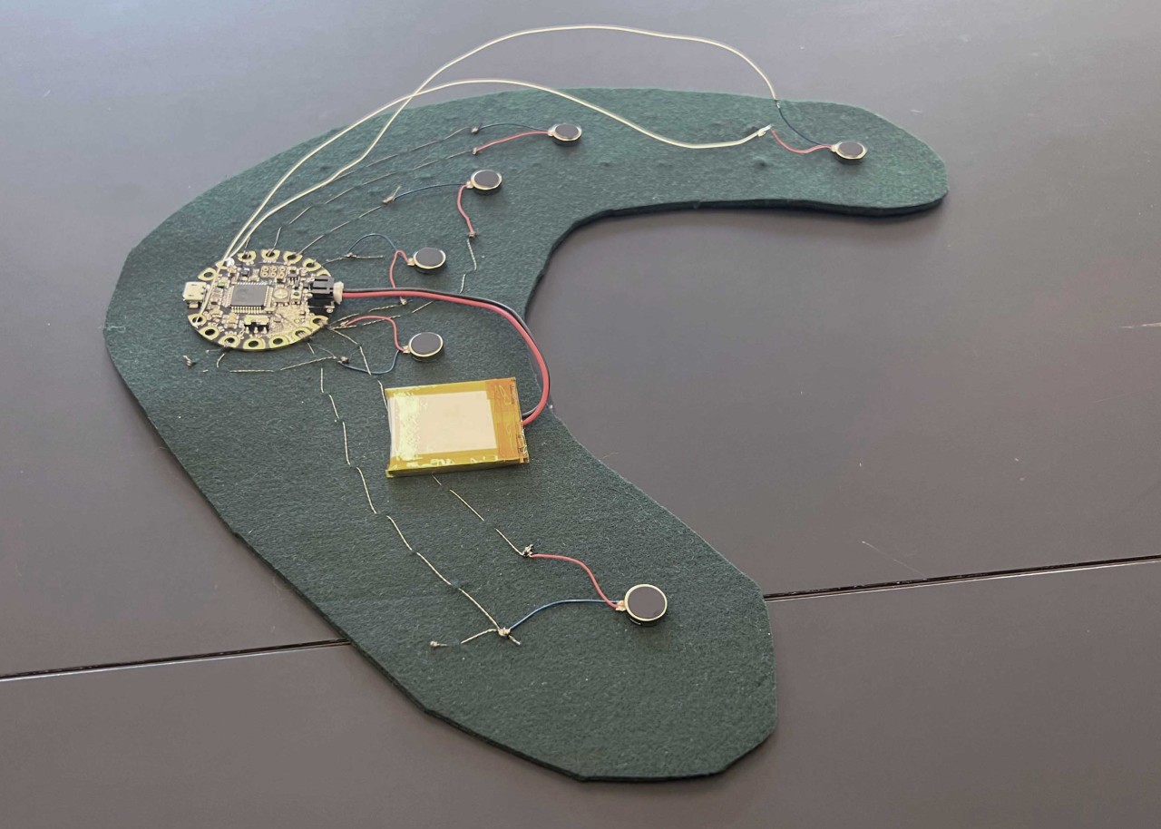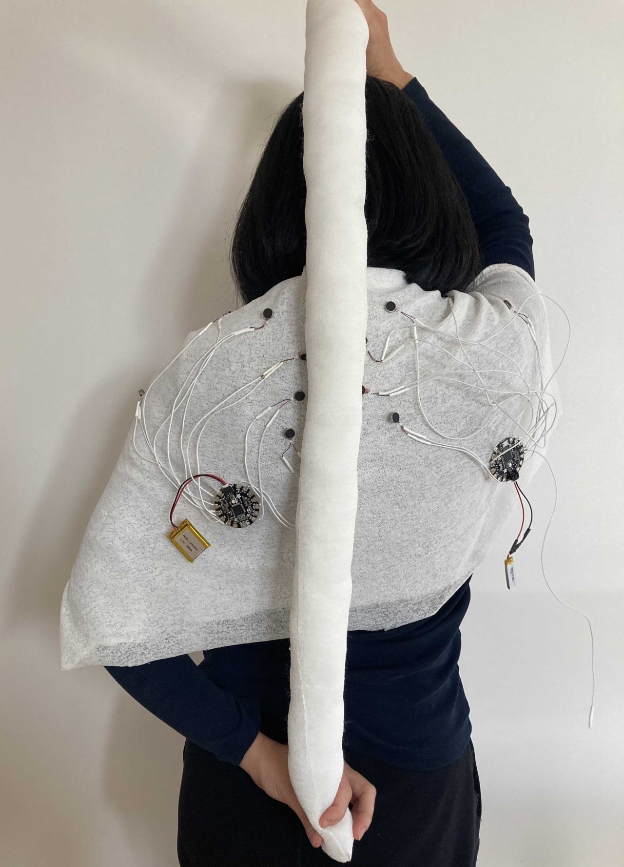 Liikumiskunstnik uuris esialgu kokkupuutumist igapäevaste esemetega, et tunnetada oma keha ning somaatilisi reaktsioone materjalidega kohtumisel. Esimese disaini iteratsiooni puhul uurisime käte, erinevate tekstiilmaterjalide ja väikeste vibreerivate mootorite puutetundlikkust. Me lõime vildist seljaskantava vormi, millele kinnitasime 12 vibreerivat mootorit (see vastab keha 12 akupunktile; foto 2.1). See mähitakse ümber selja ülaosa ja õlgade piirkonna, et tekitada lõdvestumist soodustavat tunnet. Teise iteratsiooni puhul keskenduti sellele, et tuua tundmused veelgi lähemale kandja kehale, kinnitades mootorid omakorda elastse tekstiili külge, mis on tihedalt ümber ülakeha mähitud. Väljaspoole lisati puuvillaga täidetud pehmed rullpadjad, millele kandja saab toetuda, et suurendada vibratsioonitunnet (foto 2.2). Kuigi vibratsiooni tajumist suurendati, takistas elastne vorm kandja liikumisvabadust. See viis kolmanda iteratsioonini, et luua erinevate pindade ja täidistega pehmete tuubide komplekt (foto 2.3). Lisaks liikuvusele ja tekstiili enda omadustele lisasime esemetele interaktiivsuse, paigutades nende sisse elektroonilised komponendid, nagu kallutusandurid ja vibratsioonimootorid. Need võimaldasid juhtida fookuse konkreetsele kehaosale uutmoodi. Tajukandjate tekstiilipinnad kutsuvad kasutajat tajukandjaid puudutama, painutama, väänama, raputama, hoidma ja pigistama, katsetades liigutusi, mis laiendavad kasutaja kineetilist teadlikkust ja suurendavad enesekogemust7.