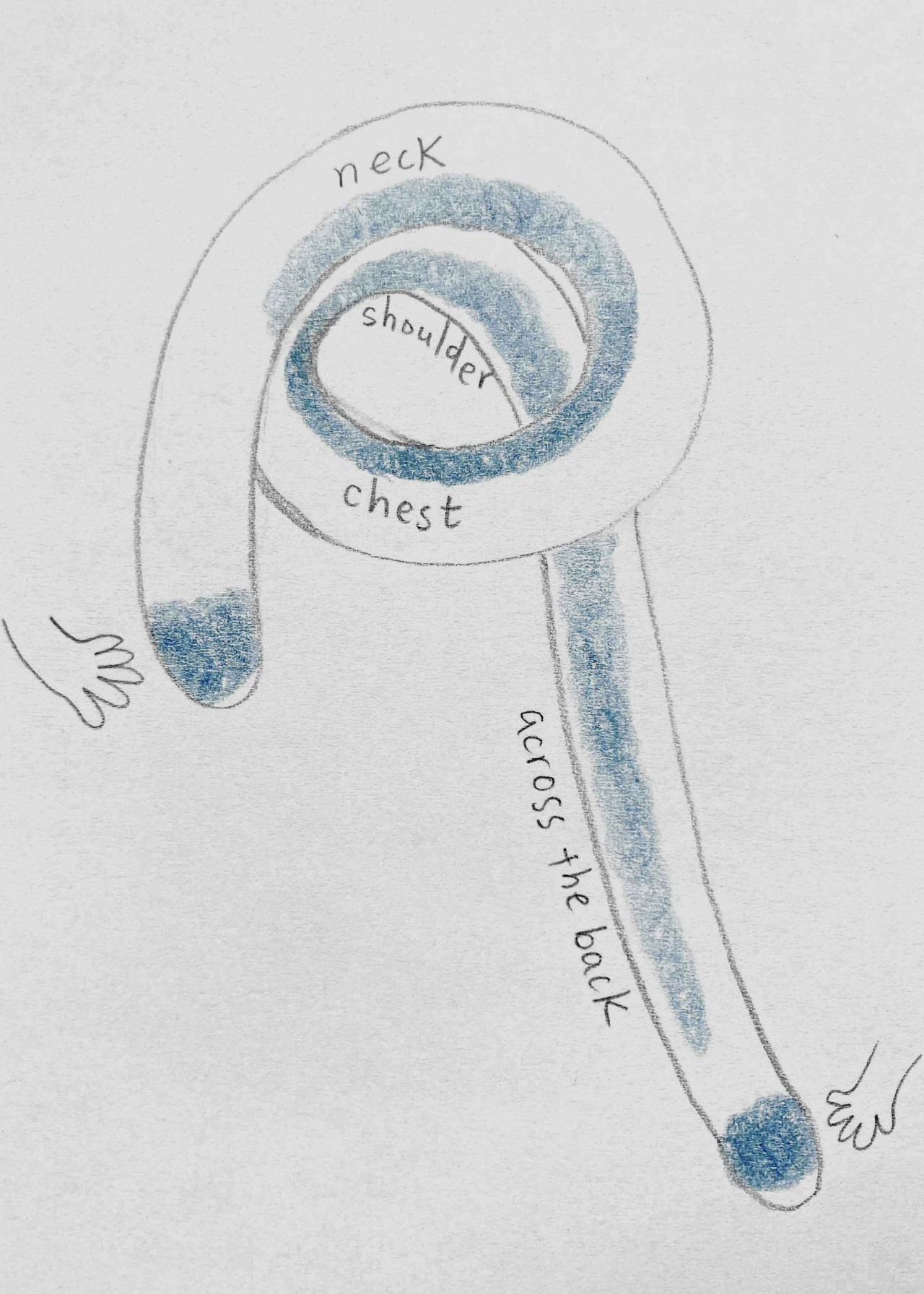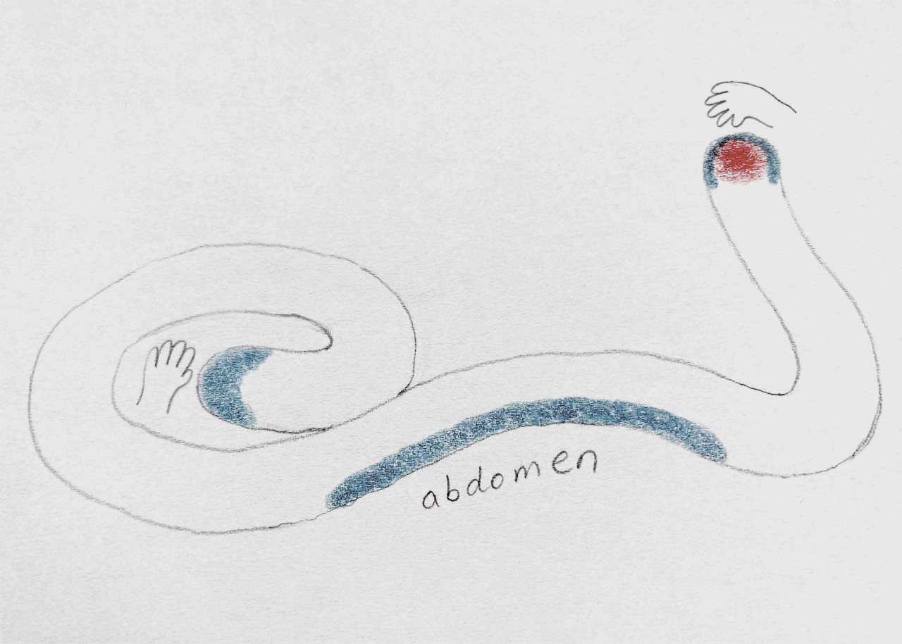 Joonis 1. Tajukandjate portreed, mis dokumenteerivad eseme asukohta kehal (pliiatsijoon), kokkupuutepindu liikumiskunstniku kehaga (sinisega) ja vibratsiooni tunnetamist (punasega). Joonistust täiendab päevik, milles kirjeldatakse kunstniku vaimseid ja emotsionaalseid kogemusi. Joonistused: Hsuan-Hsiu Hung