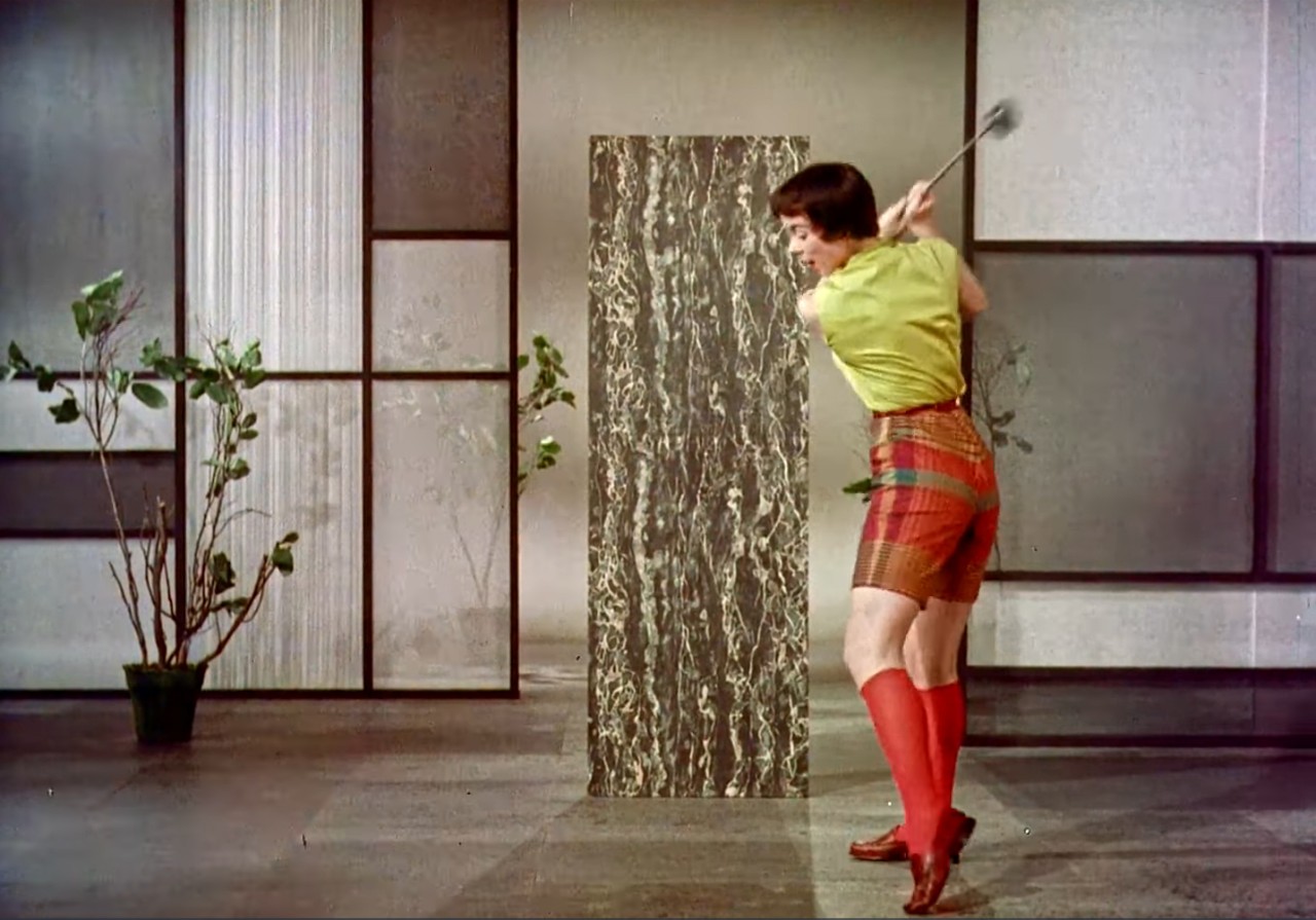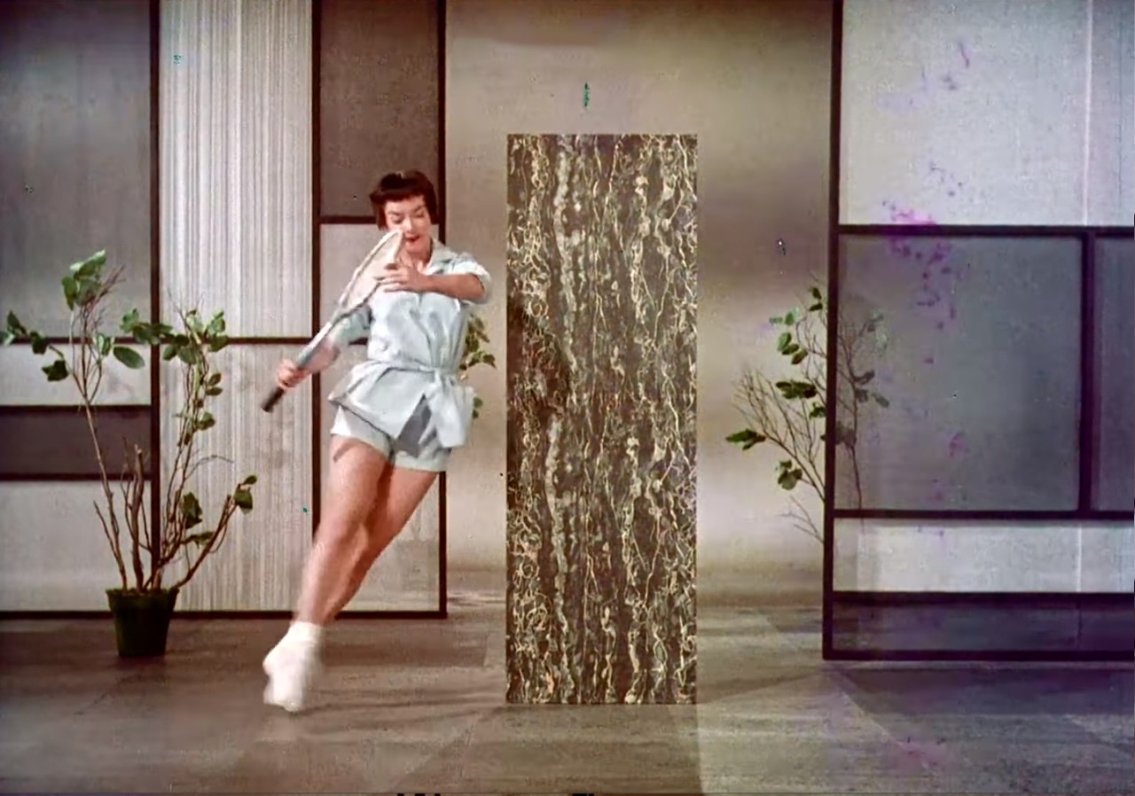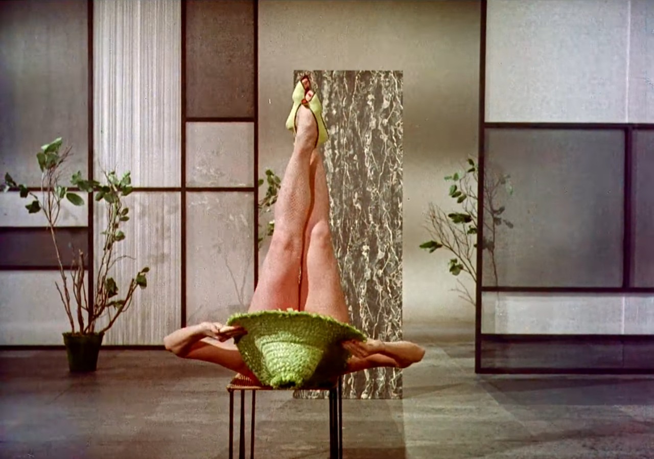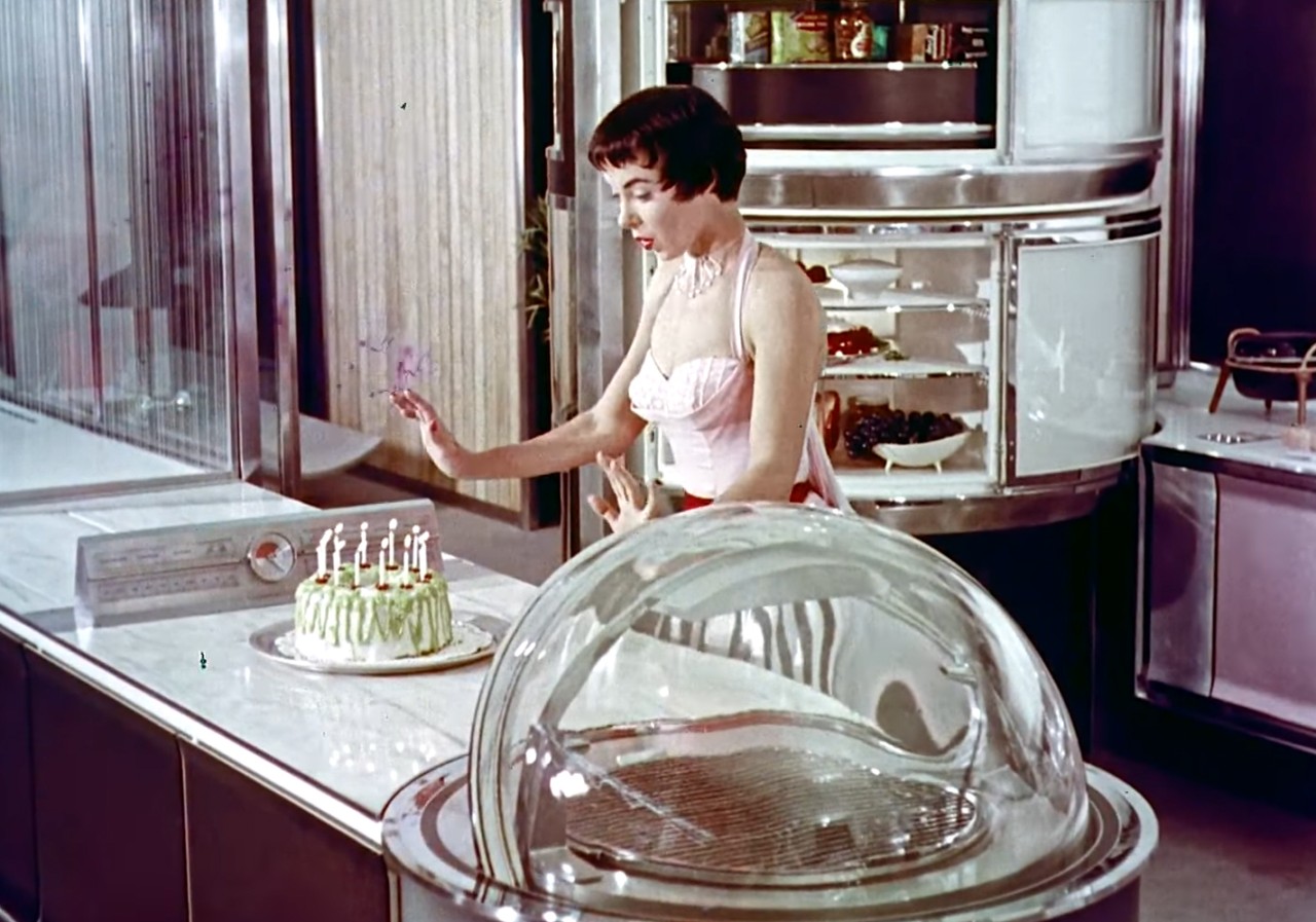 Kuigi köök on eelkõige söögitegemise koht, ilmub toit eeskujuliku köögi pildile enamasti kunstlikult lavastatud natüürmordi kujul: lilled, puuviljad, küünlad jne. Need esemed mängivad nähtavasti sama rolli nagu ajaloolise maaližanri puhul, tähistades tellija uhkust ehk „mida kõike kulla või raha eest saab“.14 Koduperenaise figuur köögiinterjööris kehastab mitte köök-tehase töölist, vaid stereotüüpset „lahket võõrustajat (vaataja-omaniku naist)“ või seksobjekti.15 Elegantselt riides võtab ta külalisi või töölt naasnud abikaasat vastu. Kõikidele „stiliseerimise kultuuri“ klišeelikele võtetele keskendus nt General Motorsi reklaamfilm „Design for Dreaming“ („Disain unistamiseks“, režissöör Victor D. Solow, 1956). Köök ja selles tantsiv koduperenaine (Thelma Tadlock) on esitatud samal määral ihaldatud objektidena, nagu Buick, Chevrolet Corvette või Cadillac (Pildid 5–7). Vahukoore ja küünaldega kaunistatud kook valmib vaid ühe nupuvajutuse tulemusena, samal ajal kui seksapiilne peategelane vahetab jõudeklassi puhkusega seostuvaid tennisisti, golfimängija ning rannapuhkaja kostüüme. Köök esineb läikivasse terasesse, plasti ning klaasi pakitud tingliku arhitektuurivormina (Pilt 8).