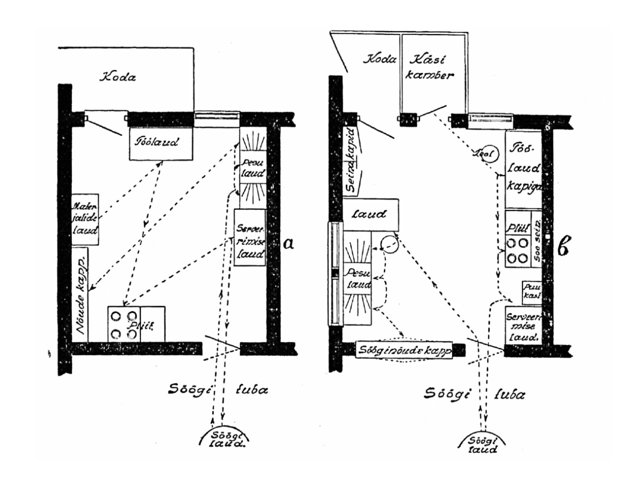 „The New Housekeeping“ ilmus Irene Witte saksakeelses tõlkes aastal 1922 („Die rationelle Haushaltführung“), muutudes koduperenaiste ning arhitektide-avangardistide piibliks. Saksa kultuuriruumi kaudu levisid kodustatud teilorismi ideed üle maailma. Eesti Tarbekunsti- ja Disainimuuseumi praegusel püsinäitusel võib näha suurendust kahest Fredericki köögiplaanist enne ja pärast ratsionaliseerimist, need ilmusid ühe artikli illustratsioonina 1930. aasta Taluperenaise maikuu numbris6 (Joonis 1). Iseenesest on koduperenaise liikumistrajektoori tähistamisviis punktiirjoonte abil muutunud ikooniliseks, mis justkui tõestab iga liigutuse teaduslikku põhjendatust ja edasi-tagasi käimise lõplikku kadumist. Oma punktiirjoonte tõmbamisel ei võtnud Frederick arvesse mitmete tegevuste samaaegset sooritamist (nt mitme roa valmistamise puhul) ega mitme inimese tegutsemise võimalust köögis. Vaatamata mainitud puudusele on see ruumi planeerimise printsiip juurdunud efektiivse köögi kujundamise nurgakivina.