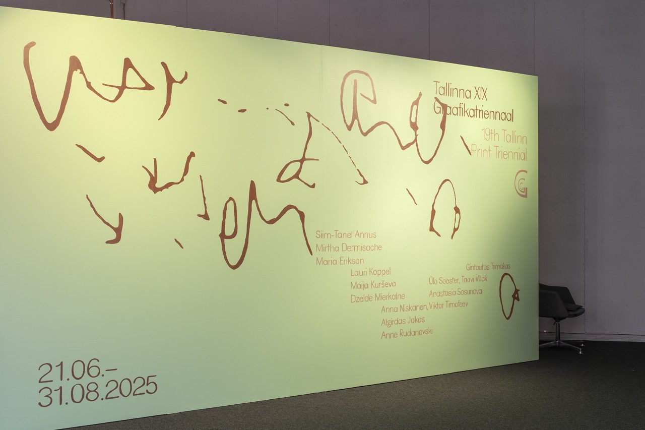 Tallinna XIX Graafikatriennaal, mis avati 2025. aasta juunis Tallinna Kunstihoone Lasnamäe paviljonis, näitlikustab seda sageli märkamatuks jäävat tööd, mis käib näituste graafilise disaini juurde. Märkimisväärse hoole ja detailitunnetusega käsitsi maalitud seinatekst on selle ilmekas näide. Näituse graafilised disainerid Paula Buškevica ja Louise Borinski sõnasid, et tegu oli kunstiasutuse teadliku valikuga vähendada mittetaaskasutatava plastprügi hulka, näiteks vinüülkleebiste kasutust. Käsitsi maalitud pealkirjasein oli Lasnamäe paviljonis juba varasemate näituste käigus väljakujunenud tava. Disainerid valmistasid ette faili, mida seinale projitseerida, mille järgi maalis siis teksti seinale kunstnik Solveig Lill.11 Selline lähenemisviis erineb tugevalt tavapärasest praktikast Austraalia kunstigaleriides, kus eelistatakse vinüülkleebiseid nende mugava kasutuse ja viimistletud väljanägemise tõttu. Kuigi vinüülkleebiseid saab vigade tegemise korral kiirelt uuesti trükkida ja välja vahetada, siis oma olemuselt on see raiskav meetod. Triennaali otsus võtta omaks teksti ajamahukas käsitsi maalimine osutab keskkonnateadlikkusele ja füüsilise töö väärtustamisele – lähenemine, mille on sageli asendanud digitrüki mugavus.