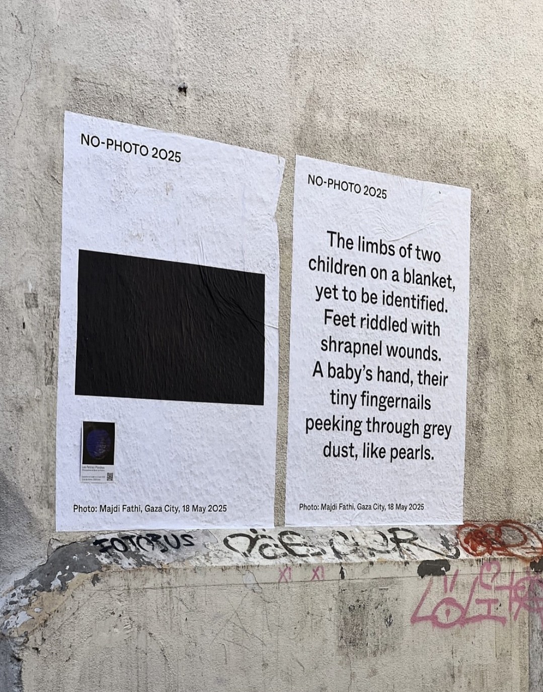 NO PHOTO 2025 on rahvusvaheline ja anonüümne kunstnike ja aktivistide rühmitus, kelle eesmärk on tuua tähelepanu Gazas tegutsevate fotograafide ja ajakirjanike tööle. See on festivalivastane algatus, mis ärgitab ühiselt mõtisklema selle üle, kuidas pildid või nende puudumine saavad „mobiliseerida avalikku arvamust ning panustada võitlusesse inimõiguste ja sotsiaalse õigluse eest“.14 Fotograafia vahendusel saame olla tunnistajaks koletuslikele kuritegudele, üleni mustaga kaetud pildid aga peegeldavad Palestiina teema puudulikku esindatust festivali kureerimisel.15 See muutub iseäranis teravaks kontekstis, kus fotograafiline kujutis on seatud ühiskondlike ja poliitiliste teemade esindamise keskseks vahendiks. Nende piltide festivalilt väljajätmine annab tunnistust kaassüüst, mida kannavad institutsioonid, kes seavad rahalised toetused moraalsest vastutusest kõrgemale. Nende asutuste tegevust dikteerib hirm majanduslike partnerite hukkamõistu ees; see on vastuolus nende väljakuulutatud missiooniga toetada kunsti ja kultuuri kui „vabade ja radikaalsete ideede valda“.16