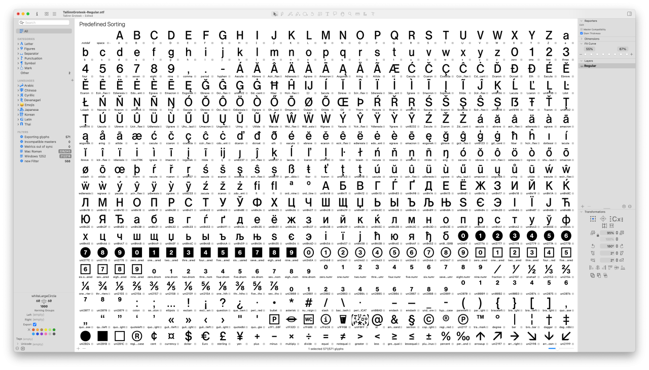 Kui olime kirjatüübi kallal juba mõnda aega töötanud ja sellest põhjalikult nii-öelda läbi imbunud, olime valmis samas stiilis fonti täiendama ning lisama puuduolevaid tähemärke. Kirillitsa tähed oli õnneks Jürna juba loonud, omalt poolt saime lisada mõned diakriitikud, valuuta- ja muud sümbolid ning kirjavahemärgid. Toredaks avastuseks olid ka Pirita purjespordikeskuse viitade joonistel leiduvad üksikud ikoonid, nagu näiteks „hot dog“ ja „karastusjook“, mille lisasime tähemärkide loetellu. Kokku sisaldab Tallinn Grotesk hetkel üle 500 erineva tähemärgi. Töö kirjatüübi kallal on veel pooleli, plaanis on lisada mõned stiilid, nagu Monospace ja Stencil, eri paksustes, et kokkuvõtteks moodustuks terviklik infokirja vajadusi kattev kirjapere.