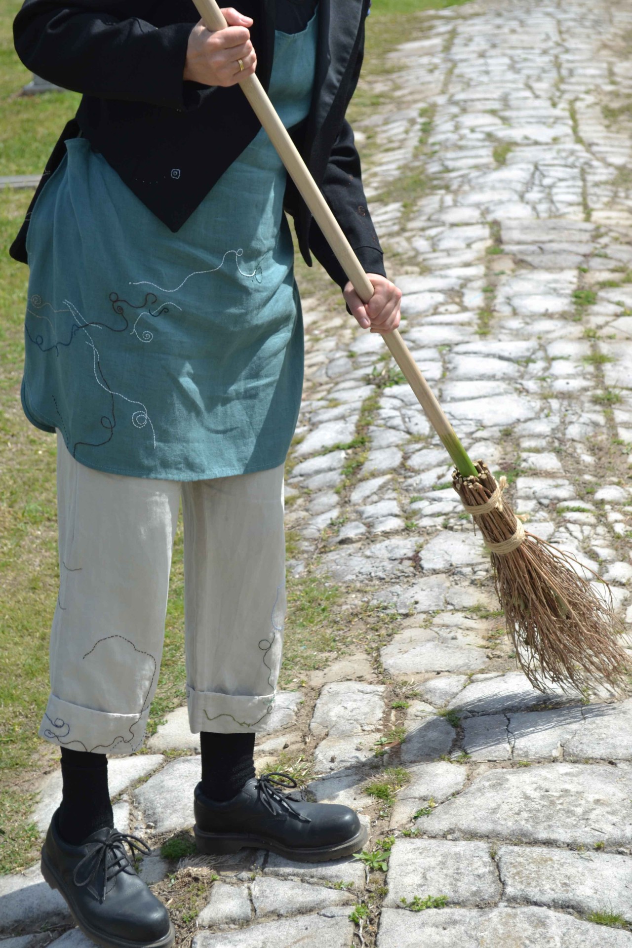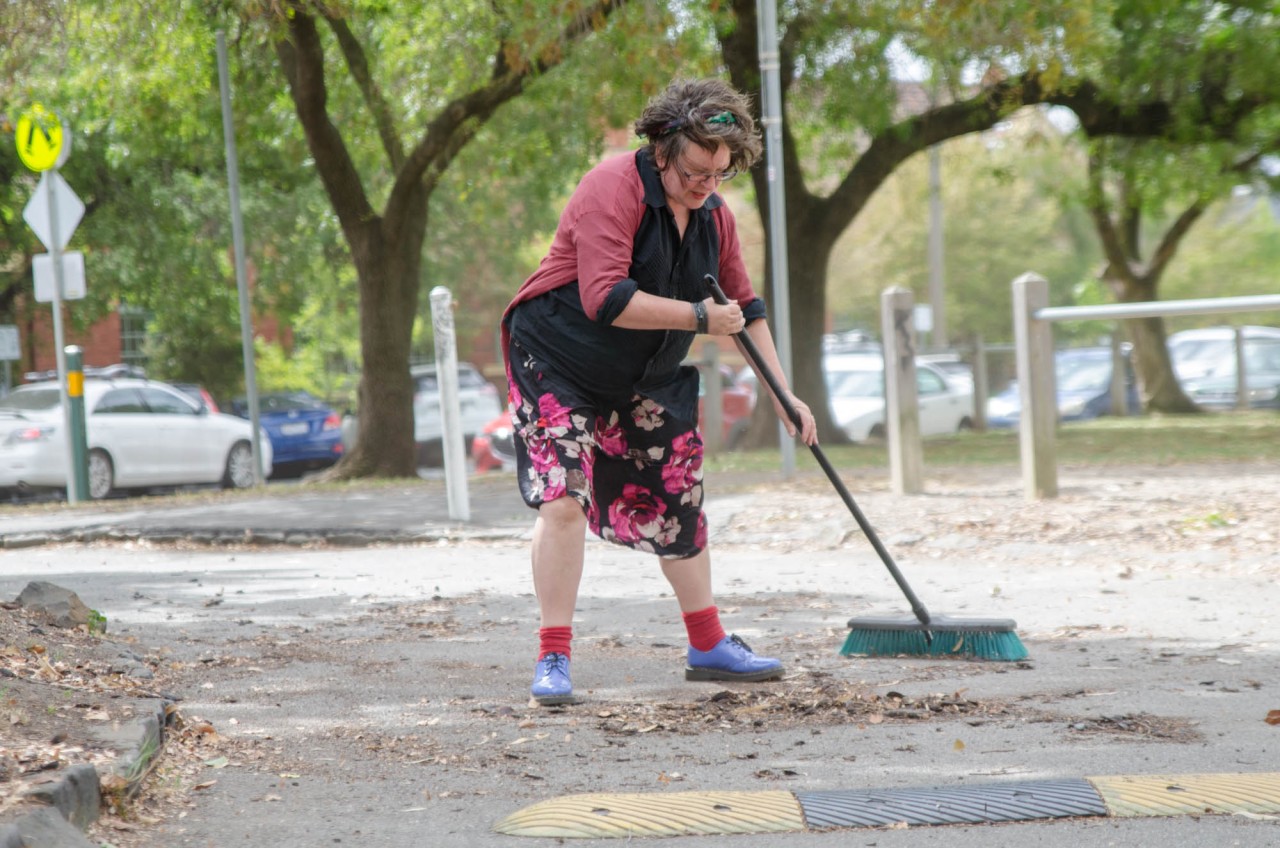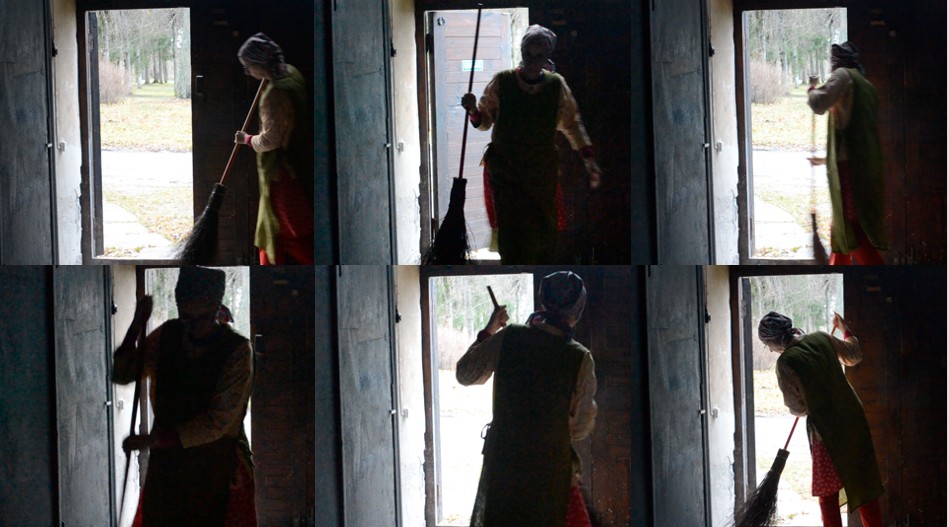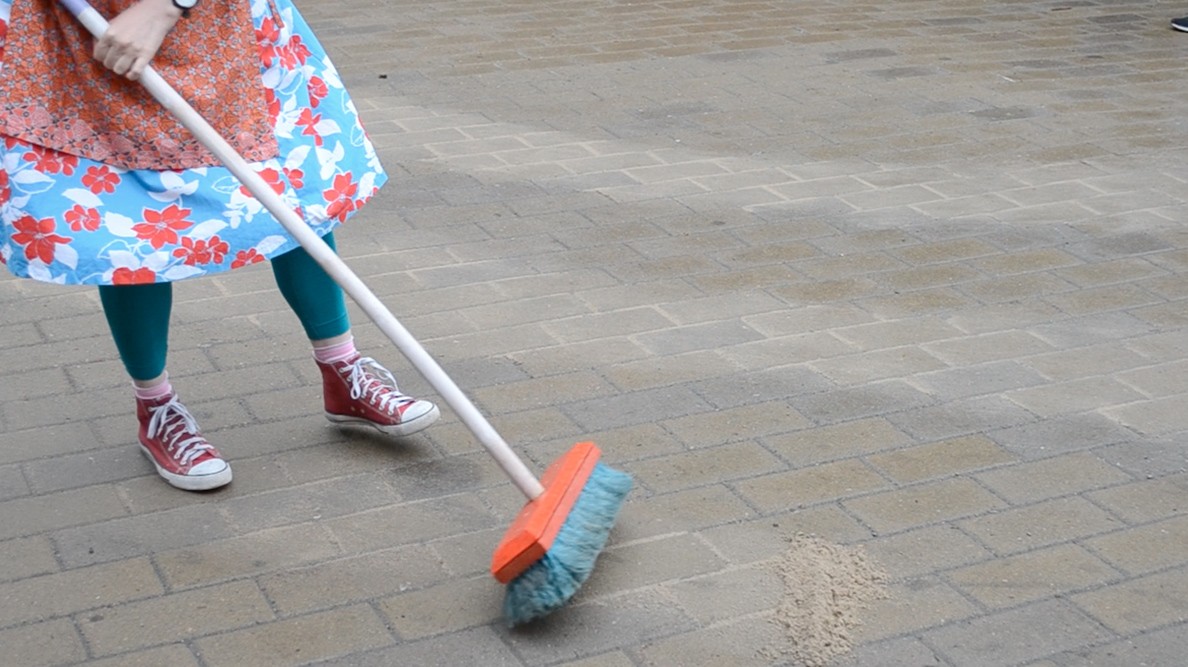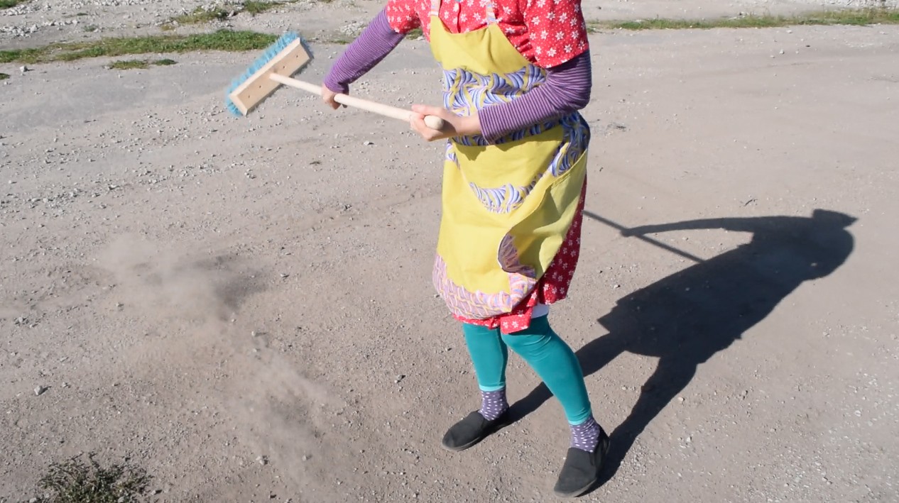 Enne kui räägin lähemalt, mida ma nende performance’ite käigus avastasin, tahaksin rääkida koristamisest laiemalt ja vaadata mõningaid põhjuseid, miks inimesed koristavad. Üks ilmselge ja väga praktiline põhjus on see, et tahame korras tuba – asju eest ära panna, ruumi teha. Kõnniteid pühitakse, et oleks selge, kus me kõndima peame, et me ei koperdaks erinevate asjade otsa ega libiseks vihmamärgade puulehtede peal. István Szabó filmis „Uks“ („The Door“), mis põhineb Magda Szabó samanimelisel poolautobiograafilisel romaanil, pühib Emerence’i-nimeline tegelane, keda mängib Helen Mirren, filmi jooksul korduvalt nii enda kui oma naabrite maja ees olevat jalgrada. Sügisel pühib ta lehti kokku, talvel lükkab lund. Filmi jooksul näeme me teda aina uuesti pühkimise juurde tagasi pöördumas. See on tegevus, mida on tarvis korrata.