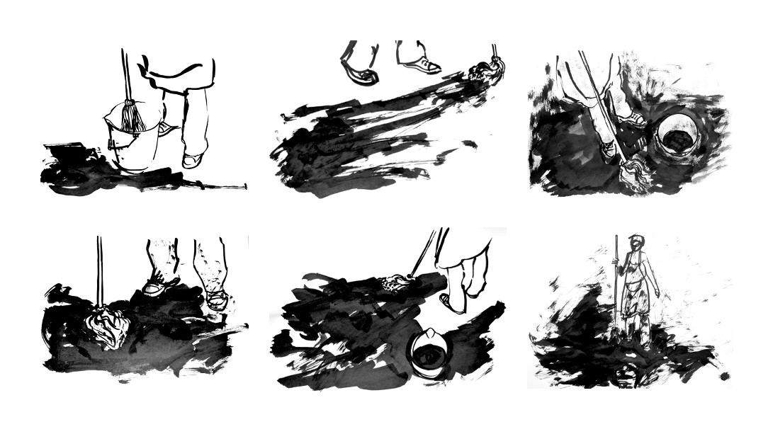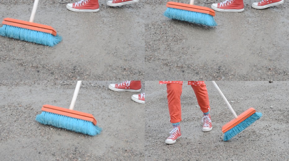 Kuigi see algab performance’ina publiku ja kaamera ees, saab see piir tõelise ja mittetõelise koristamise vahel peagi ületatud. Luud liigub nii, nagu luud peaks liikuma ning kohtub tegevuse käigus asjadega, mida siia-sinna liigutada. Näiteks kruusa, liiva, pisikeste plastiku- ja paberitükikestena, mõne roostes kruviga. Teen selgeks, mis iga väiksemgi asi on, ja hakkan tegelema valimise ja sorteerimisega. Kas ma pühin selle asja ära või jätan maha? Puna-sinise harjaga hallil kruusa taustal tegutsedes hakkasin märkama igat värvi prügi. Mul on tunne, nagu aitaks värviline hari mul neid korraga märgata. Enamikus on need plastikust osakesed ja ma hakkasin juurdlema, ehk peaksin need üles korjama ja prügikasti viskama või muud moodi looduse hallist keskkonnast eemaldama. Olen märganud ka seda, et kui esmapilgul puhtal pinnal pühkima hakkan, ilmub sinna mustus. Hari leiab selle üles ja ma näen, et koht, mida ma puhtaks pidasin, ei ole seda tegelikult mitte. Kunagi ei ole. Mustust leidub alati.
