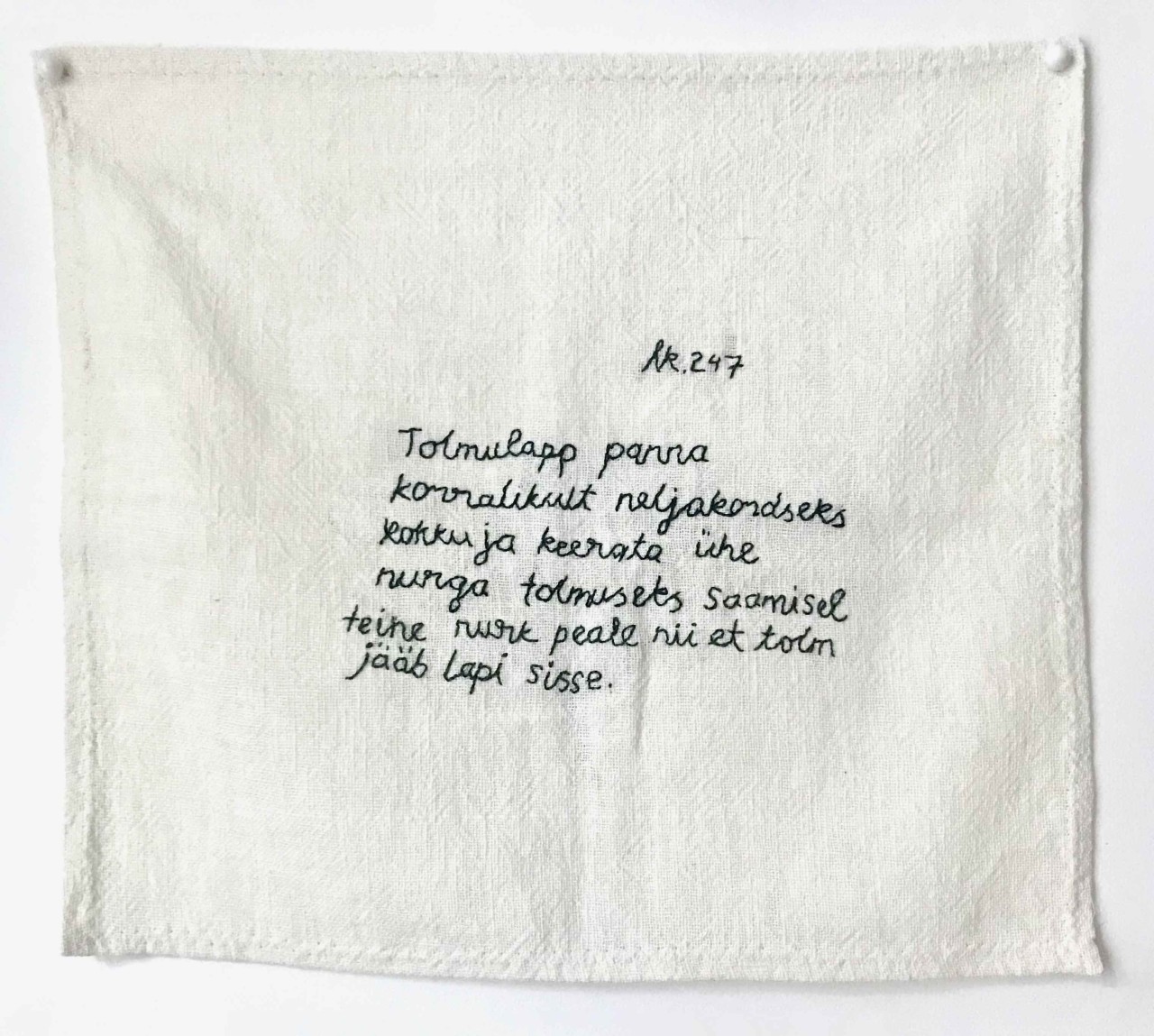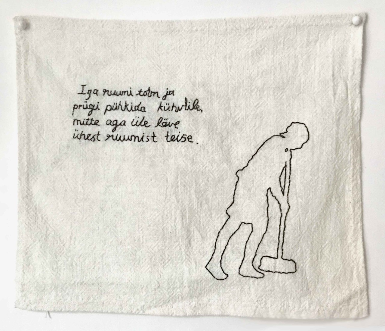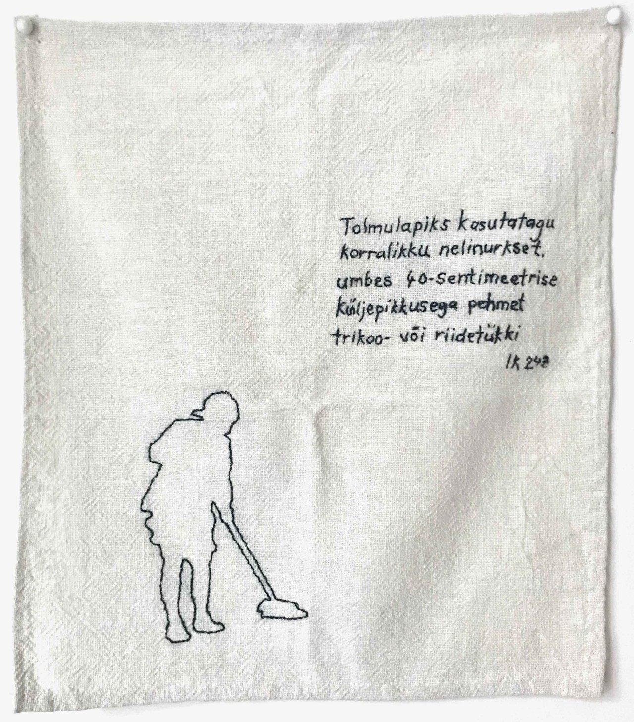 Hakkasin koristamise peale tõsisemalt mõtlema, kui alustasin 2016. aastal Eesti Kunstiakadeemias oma loovuurimusliku doktoritööga. Varem olin seda loomulikult igapäevaselt teinud ja mingil hetkel oli see hakanud ka minu installatsioonidesse teemana sisse tulema – peamiselt tolmuimejate, köögirätikute ning muu koristamise ja kodususega seotud esemete kaudu. Kui olin galeriide põrandatele ja seintele joonistusi teinud, lõppesid sellised näitused alati joonistuste eemaldamisega. Kord aga kuulsin ühel oma näitusel umbes niisugust kommentaari, et koristamine ei ole kunst. Kuuldu tõukas mind selle ideega põhjalikumalt edasi tegelema. Peagi tabas mind aga terve küsimustelaine: mis on koristamine, miks ma seda teen, kuidas ma seda teen, mida ma koristan, kuidas ma tean, millal asi puhas on ja mis on üldse mustus? Vastuseid otsides sai koristamisest kunst. Etendasin koristamist isetehtud vahenditega – harjade, luudade, tolmulappide, sulgedest tolmuharjadega – ning kandsin enda valmistatud põllesid, kitleid, pearätikuid ja -katteid. Kui raamistan koristamise performance’ina, mis ei ole minu igapäevaelu osa, suudan ehk koristamist, mustust ja oma tegevust selgema pilguga näha.