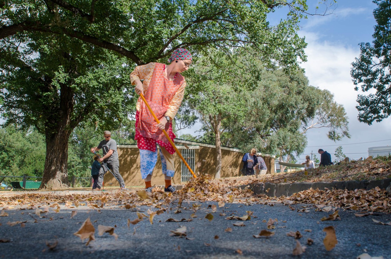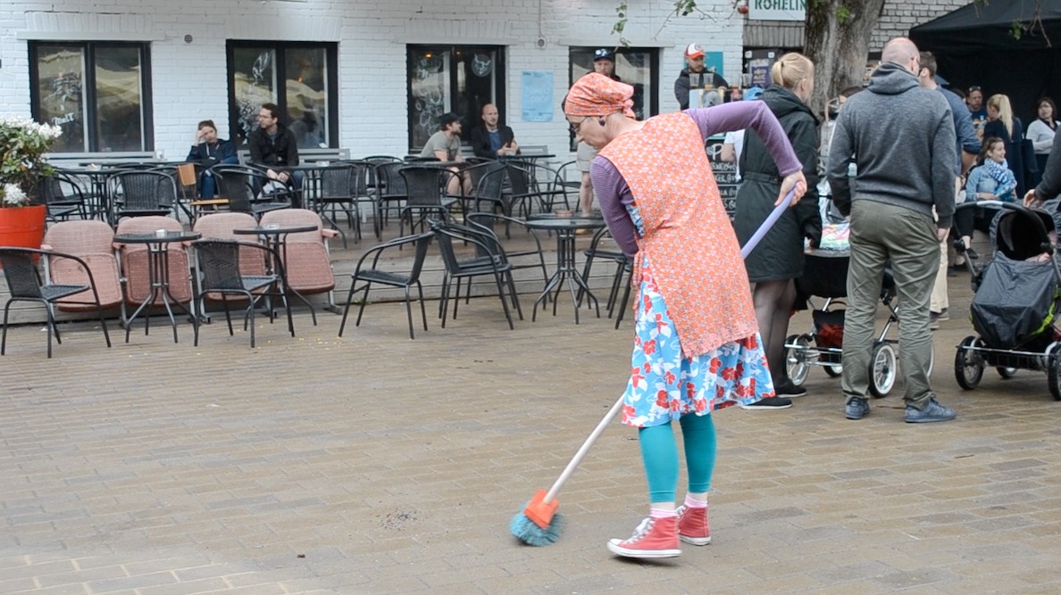 Ja mis juhtub siis, kui ma ei võta koristamist tõsiselt, vaid suhtun sellesse nagu mängu? 2018. aastal korraldasin pühkimise osalusperformance’i. Pühkisime üksinda ja vahel ka kõik koos. Ilm oli tuuline, mis tegi pühkimise üsna mõttetuks, isegi absurdseks. Kui olin lehed hunnikusse kokku pühkinud, tuli tuul ja paiskas mu töö laiali. Mingil hetkel jälitasin tükk aega ühte lehte, üritades seda teiste lehtede juurde suunata, aga lõpuks viis tuul selle ikka minema. Üks teinegi osaleja pühkis innukalt lehed hunnikutesse, aga tuul puhus temagi hunnikud minema. Vahel oli tuul siiski ka koostööaldis ja puhus lehed õigesse kohta.