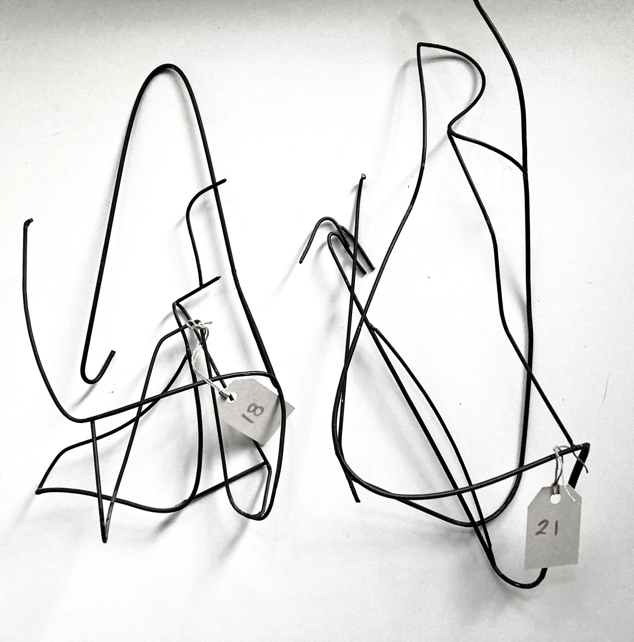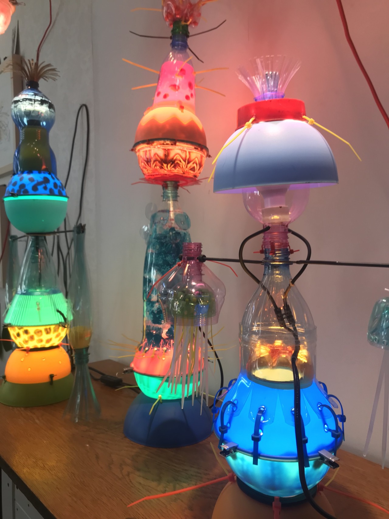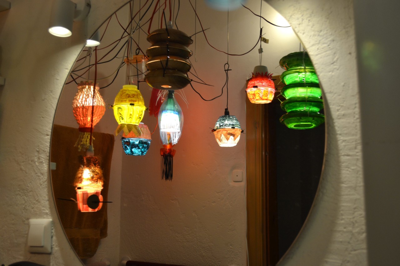… on lihtne ette kujutada, kuidas neid kasutada saaks. Ja tõesti, kui harjased olid paigaldatud, järgnes kiirelt ka nendega pühkima asumine; harjasin oma töölaualt ära saepuru, millest mingi osa oli ilmselt samade esemete valmistamise tõttu tekkinud. Kui uurin esemeid nende igapäevases kasutuses ning seejärel näitusel kunstiobjektidena, olen silmitsi küsimusega, mida üldse tähendab kasulikkus, ja samas, kuidas ja miks võiks miski olla kasutu. Mõned lambid, mille olen valmistanud, näiteks need…