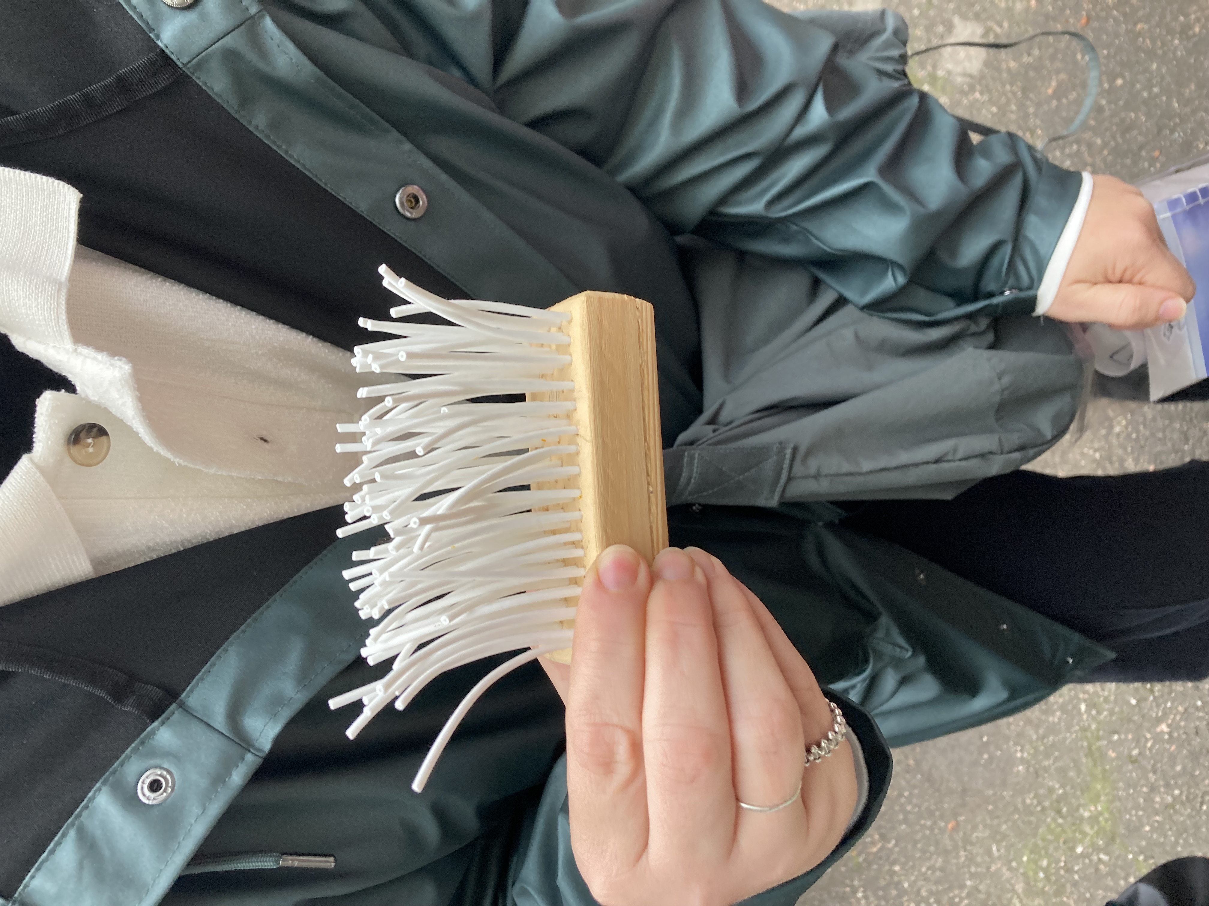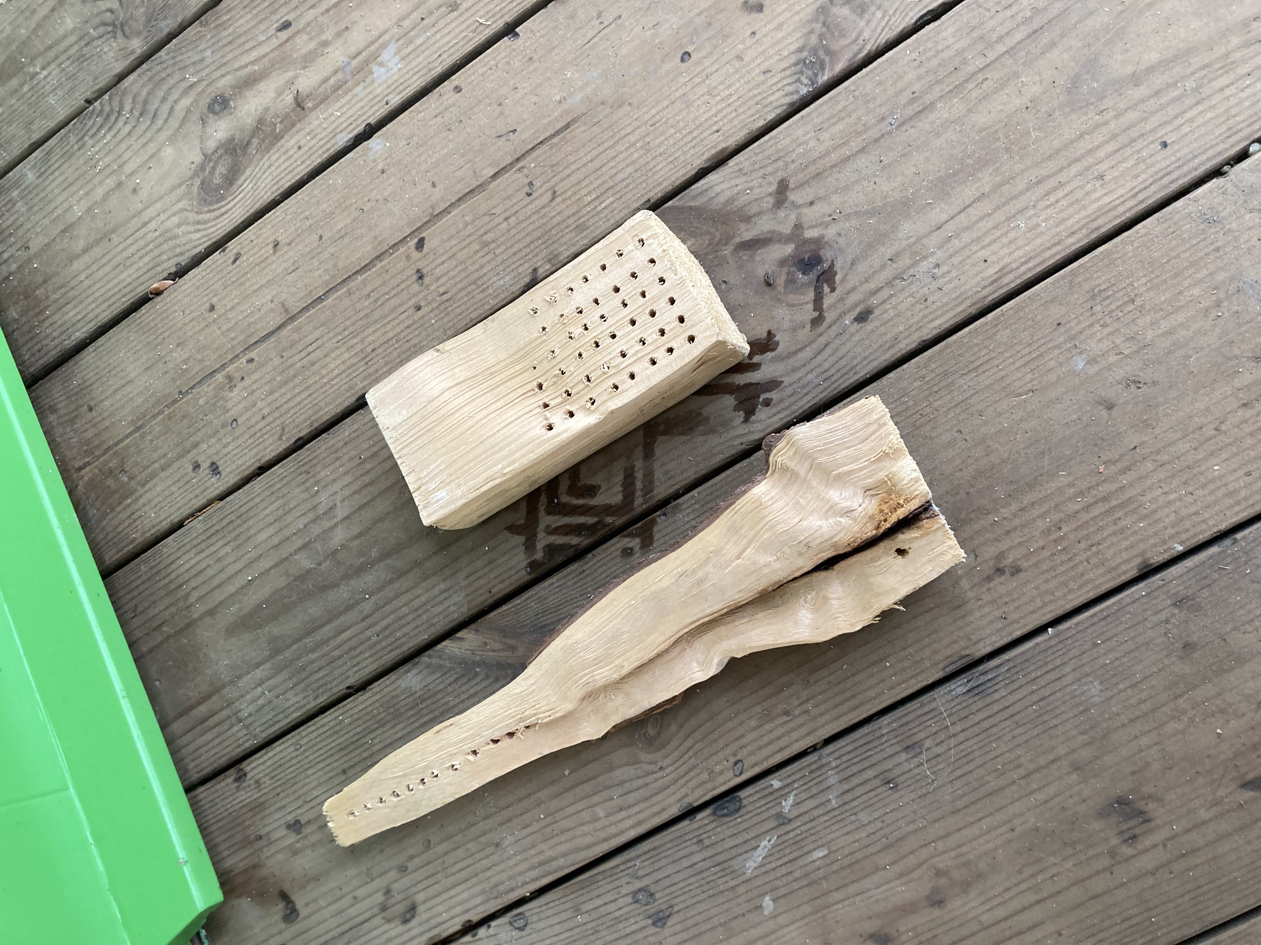 Veel üks näide asjade laia maailma saatmisest on see, kui viisin kaks teost tagasi puuhunnikusse. Üks oli valmis kunstiteos, pühkimisharjalaadne asi, millel olid kaablisidemest harjased, ja teise sisse olin puurinud augud – mõttega, et teen sellest harja, aga seda ei juhtunud kunagi. Mõlemad puuklotsid olin üles korjanud ühest puuvirnast ja nüüd jätsin need Logi sauna22 ukse ette, küttepuudeks. See oli minu viis panna asjad tagasi sinna, kust olin need võtnud.