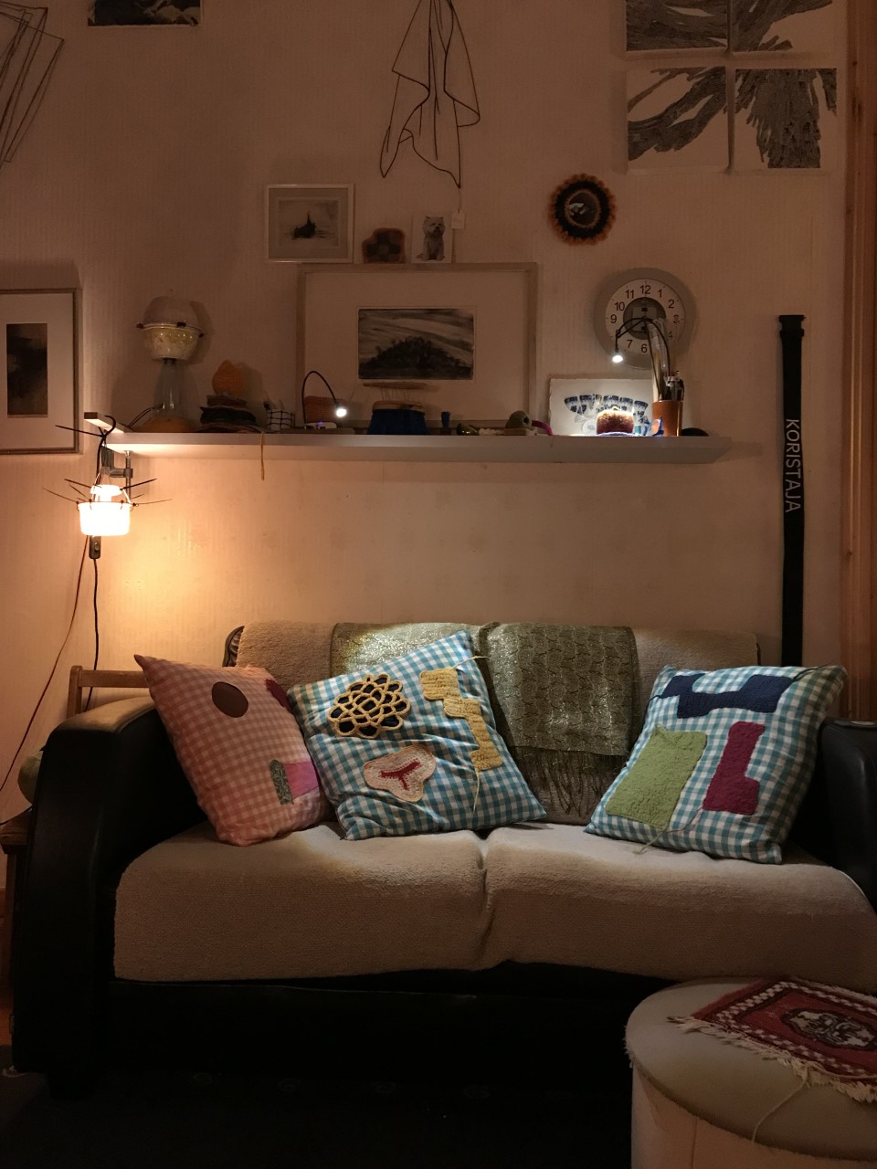 Asju saab ka ära anda. Sorteerisin asju ja leidsin kaks patja, mille olin teinud oma „Kodunäituse“21 jaoks. Näitus oli lõppenud ning nüüd võisid padjad saada diivanil osaks minu argielust. Vaatasin patju ja mõistsin, et need ei meeldi mulle. Mõtlesin naljaga pooleks: ahaa, nii saabki aru, kas miski on kunst… kui tegu on halva maitsega, siis järelikult on ka kunst. Viisin need taaskasutusse ja lootsin patjade nimel, et need leiavad uue omaniku, kes neid hinnata oskab. Saatsin nad laia maailma. (Kui keegi on neid patju näinud, siis mul oleks rõõm neist kuulda.)