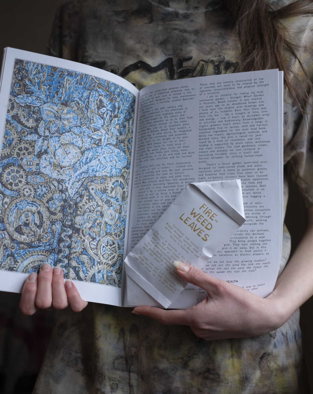 Sandra Kosorotova: Mäletan, et viimane asi, mida ma enne pandeemiat tegin, oli töötubade seeria, mida ma pandeemia ajal ei oleks saanud teha. Pandeemia on kindlasti minu praktikat mõjutanud. See, mida Juss rääkis käegakatsutavusest – pandeemia ajal tundsin ka mina sellest väga puudust. Tõenäoliselt hakkasin just sellepärast rohkem taimedega töötama, neid kasvatama ja korjama. Tundsin, et see aitab mind nii palju, et on tähtis, et ma seda teadmist jagaksin. Tegin kogukonnaaia Narvas, kus ma korraldasin ka umbrohutuure. Leidsin võimaluse tegeleda endale oluliste teemadega vabas õhus. Üks töö, mis oli kõige enam pandeemiast mõjutatud, oli WEEDS FEED care package. See oli raamat koos taimeteepakikesega, mida sai tasuta tellida. See tuli otse postkasti ja seda kõige karmima lockdown’i ajal. Raamatu olen kujundanud nii, et seda oleks mugav voodis haigena lugeda. Korjasin ja töötlesin taimi tee jaoks terve suve. Selle projektiga otsisin viise saavutada taktiilset ja kehalist kogemust nii kunstniku kui ka kunsti kogejana ajal, kui füüsiline kokkupuude on piiratud. Pandeemia ajal oli minu praktika rohkem sotsiaalselt angažeeritud. Lockdown’i ajal sai valmis ka teos „Occupatient“, mis on raviv riideese (kasutades Ayurvastra tehnikat) ja mis meenutab oma jäätmevaba (zero-waste) lõike poolest nii patsiendi kui ka arsti kostüümi.